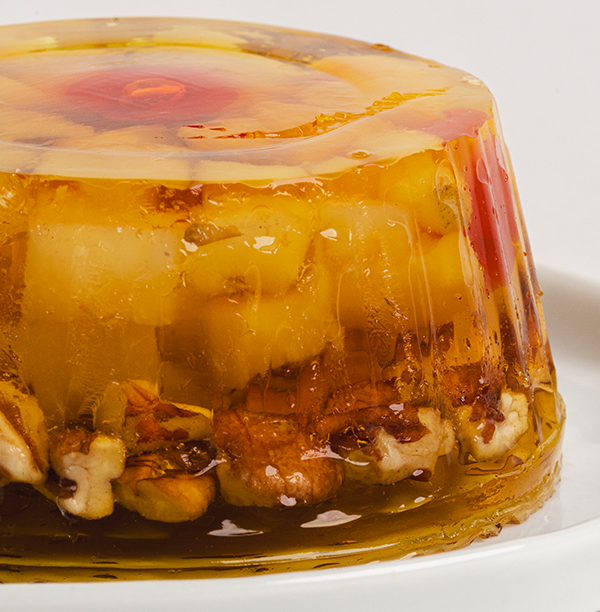Disfruta la Gelatina Primavera, una deliciosa gelatina de piña decorada con frutas como uva, fresa, durazno en almíbar y nueces. Un postre fresco y frutal, ideal para cualquier celebración.