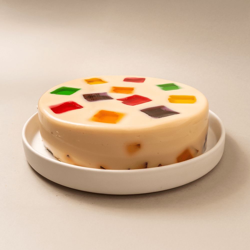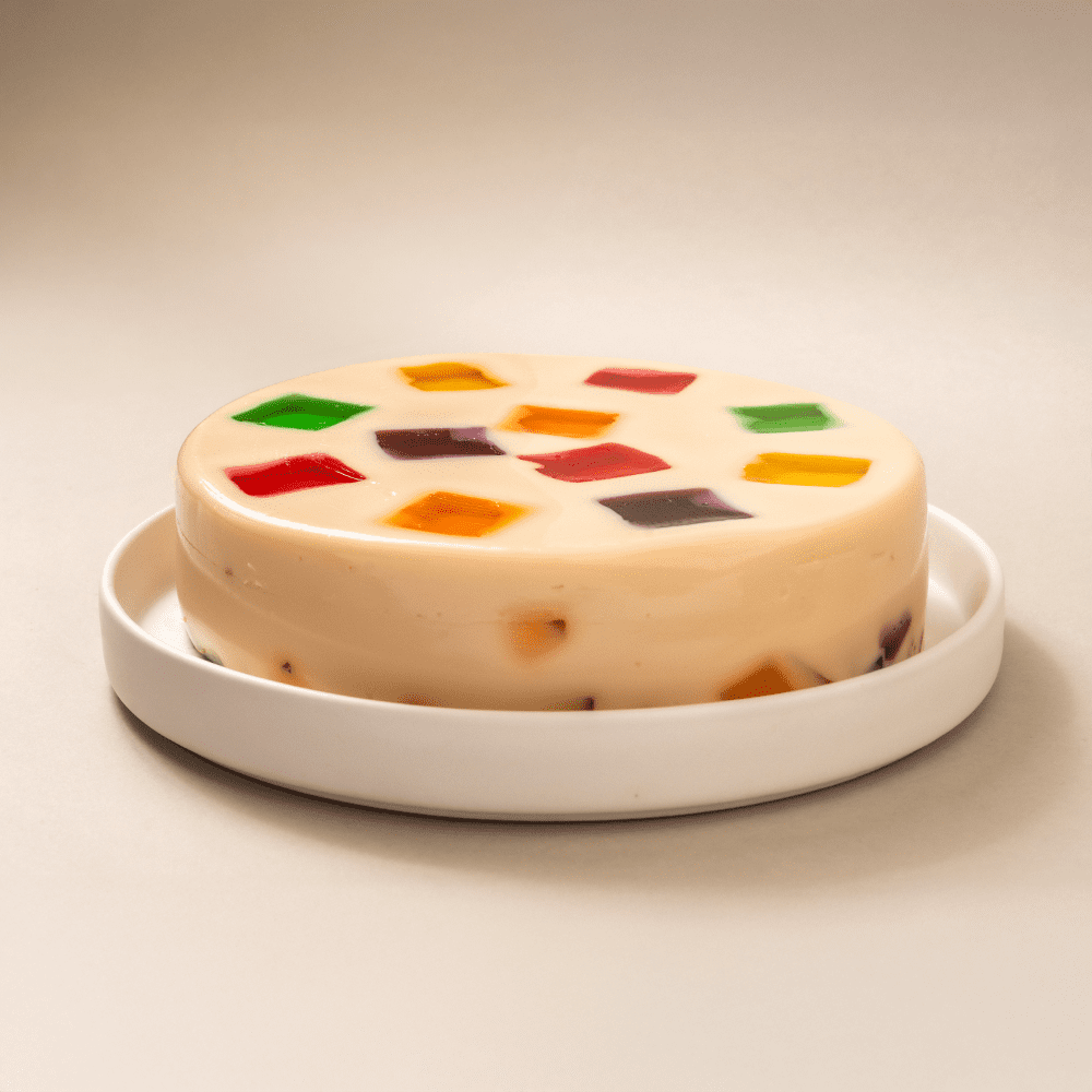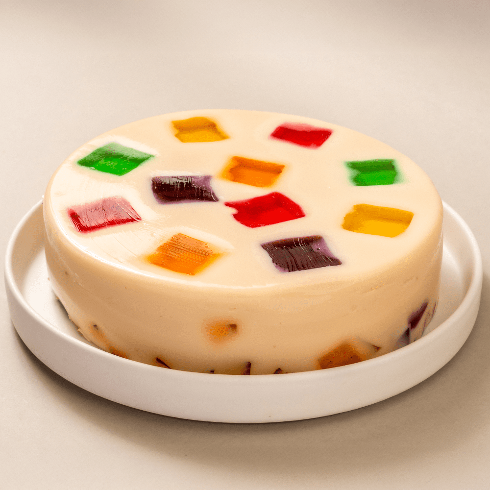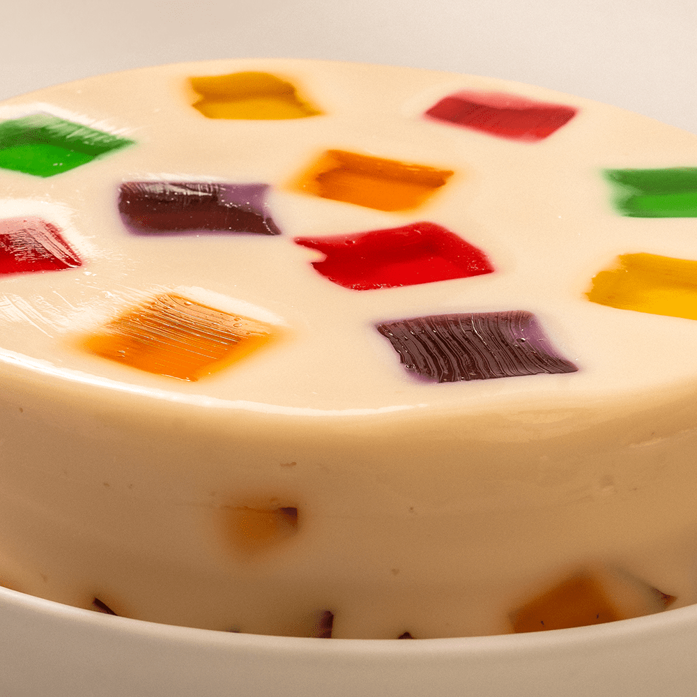 La Gelatina Mosaico combina gelatina de leche con cuadritos de gelatina de agua en sabores fresa, piña, limón, naranja y uva. Un postre perfecto para alegrar tus celebraciones con sabores frescos y divertidos.