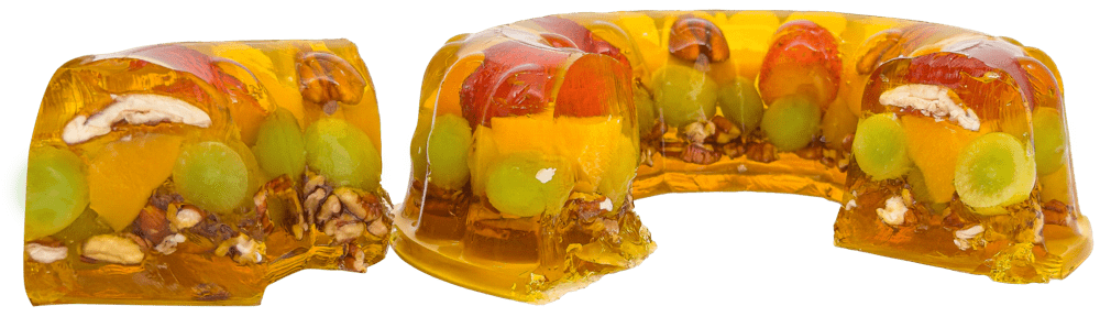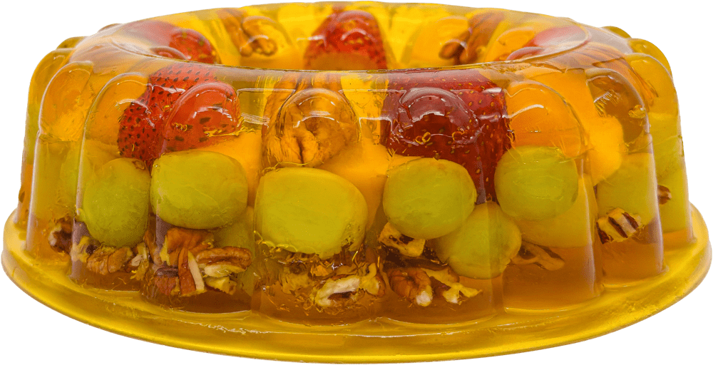 Disfruta la Gelatina Primavera, una deliciosa gelatina de piña decorada con frutas como uva, fresa, durazno en almíbar y nueces. Un postre fresco y frutal, ideal para cualquier celebración.