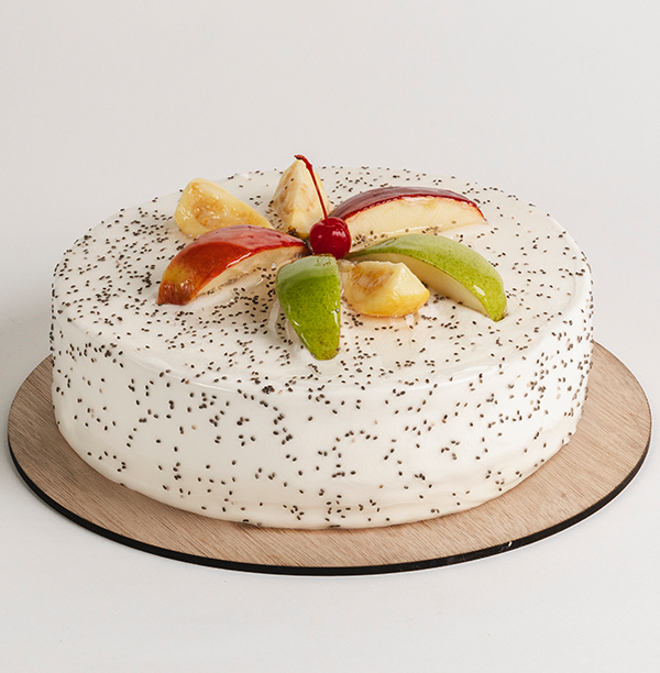 Disfruta del fresco Pastel Frutal de Chía, con pan blanco enriquecido con chía, relleno de bavaresa de limón, guayaba, pera y manzana, humectado con jugo de manzana. Un postre saludable y delicioso, lleno de sabores frutales.
