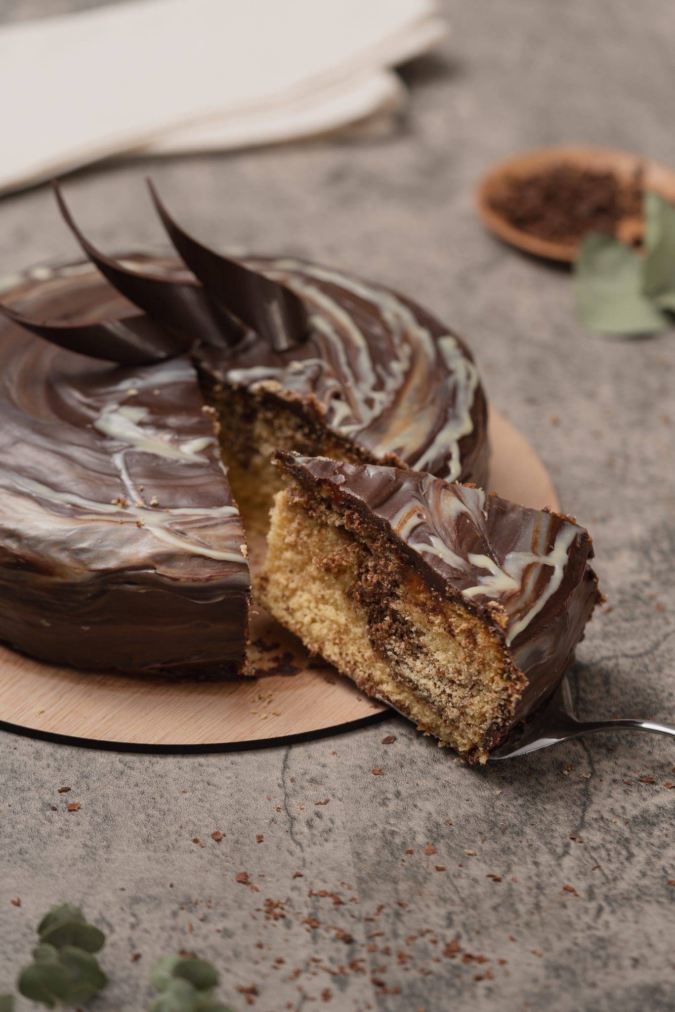 Disfruta del delicioso Pastel Marmolado: Pan a base de mantequilla, vainilla y confitier de chocolate semiamargo cubierto con mermelada de chabacano y ganache de chocolate.